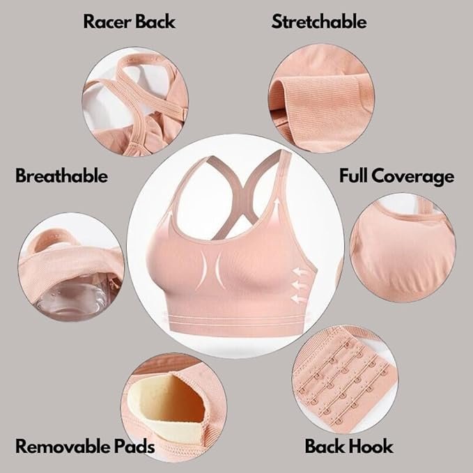 - Full coverage sports bra with Back hook Closure. 4 Line of Hook for size adjustment. Broad hem for better support and maximum comfort