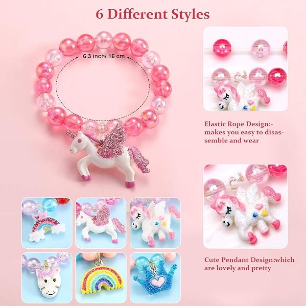 - EASY TO WEAR: Each unicorn bracelet for kids girls feature a cute hanging pendant, such as a rainbow, unicorn, or crown. The elastic rope inside ensures easy disassembly and a comfortable fit. Stand out from the crowd with these bright and lively accessories that are sure to catch everyone's attention.