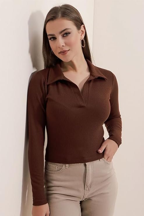 Women's Collared Neck Long Sleeve Slim Fit Casual Tee Top,