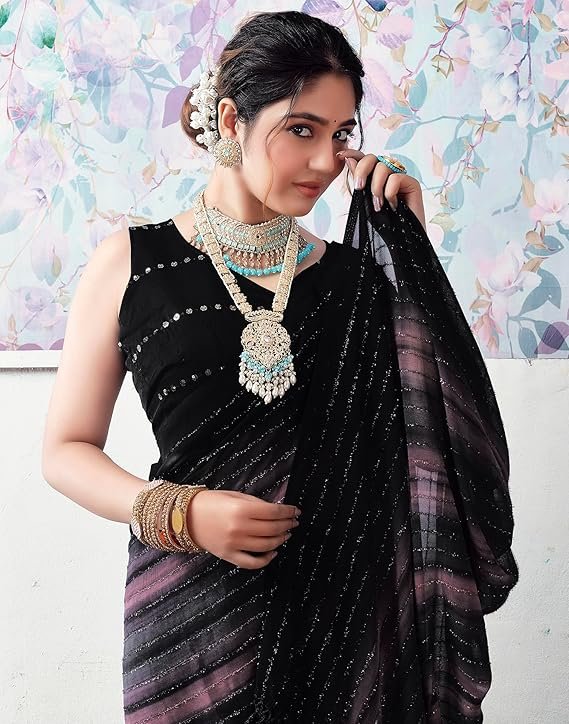 - Saree Fabric: Georgette | Blouse Fabric: Poly Cotton | Work:: Saree: Printed Zari Stripe | Blouse: Dyed, Sequence Embroidery