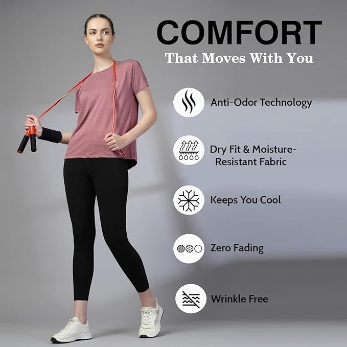- This Sports Tshirt For Women Has Anti-Odour Properties Which Never Let You Smell In Any Weather. The 4-Way Stretch Women Tshirt Construction Allows Better Movement In Every Direction And Renders Natural Movement. Its Stretch Construction Enhances Mobility For A Superior Range Of Motion. It Has The Antimicrobial And Sweat-Wicking Technology.