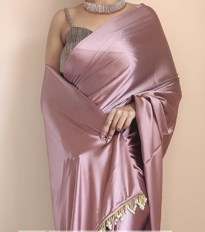 Women's Ready to Wear Rose Gold Satin Silk 1 Minute Pre Pleated Saree with Unstitched Rose Gold