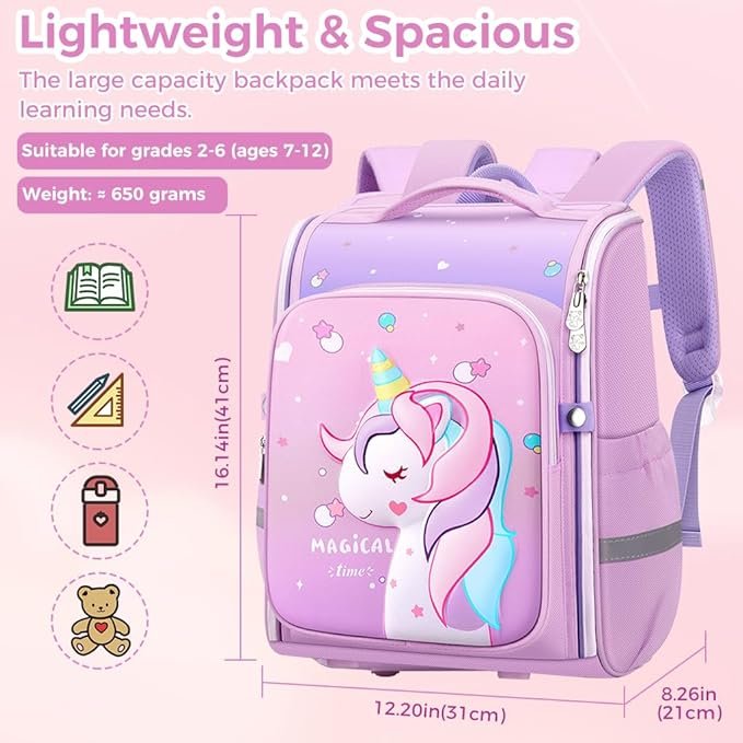 - UNICORN BAG GIRLS STRUCTURE: school bag girl designed with a main compartment, 1 front zipper pouch with cute unicorn design, 2 side pouches, enough room for books, pencil box, accessories. The built in separate compartment also can help kids to keep all stationery supplies stay well organized and classified. Fully openable zipper design allows a clear vision for contents in the school bag and easy to clean up.