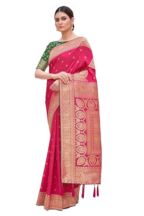 - Product Highlights : Fabric: Banarasi Silk Blend (Saree & Blouse) || Work: Zari Woven (Saree), Zari Woven (Blouse) || Colour: Saree –Pink | Blouse – Green || This Banarasi silk Blend Saree with Subtle Zari Work.