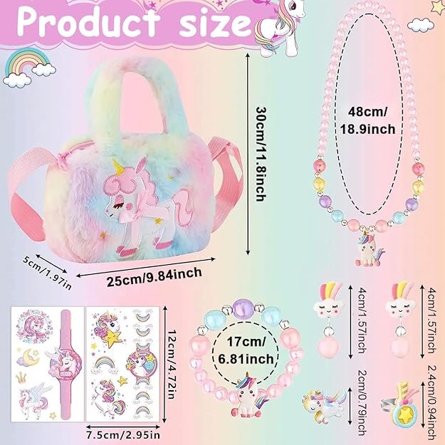 - BEAUTIFUL COMPLETE UNICORN JEWELRY SET: Our set includes a unicorn bag, a necklace for girls, a bracelets for girls, 1 pair of earrings, 2 rings and stickers, providing your little girl with everything she needs to be a princess. Perfect for girls 4-12 years old, this set captures their imagination and adds a touch of magic to their outfits.
