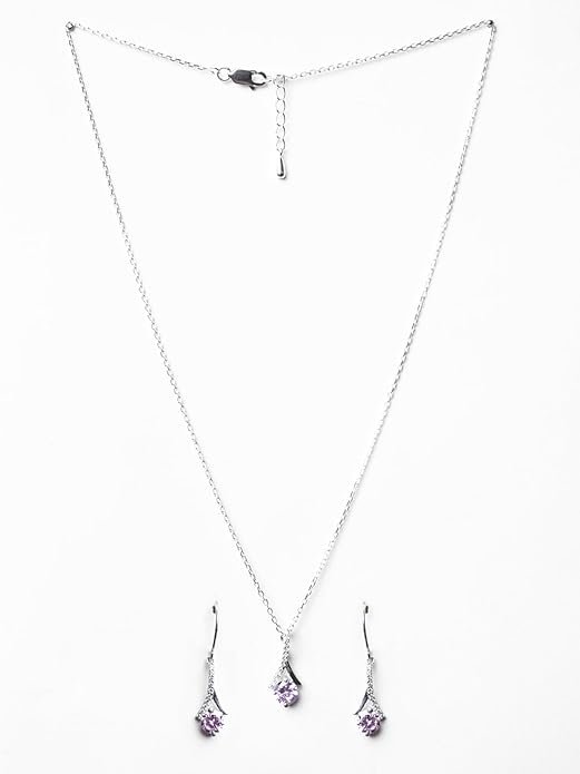 Silver Pink Solitaire Pendant Earring Chain Jewellery Set