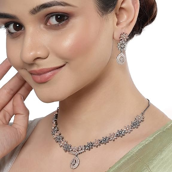 - What you get : 1 N Stylish Elegant American Diamond Studded Necklace with Matching 2 N Earrings From The House Of Zeneme.