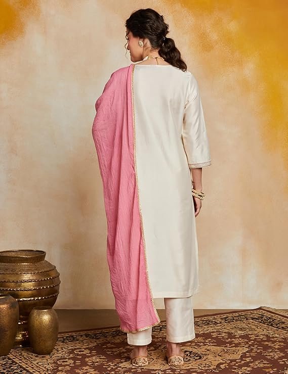 - PRODUCT DETAILS: 3-piece set featuring round neck regular fit kurta with 3/4th sleeves, zari embroidery at yoke and cuff, paired with straight fit pyjama with side pocket and contrast chiffon dupatta with lace finish.