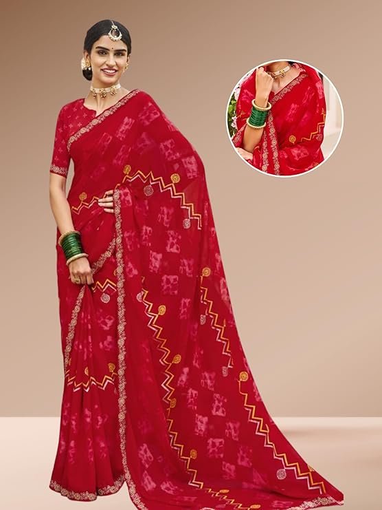 - Soft, Breathable Georgette Fabric: Comfortable and lightweight for long hours of wear | Vibrant Red Georgette Saree with Designer Prints: Perfect for weddings, parties, and festive occasions