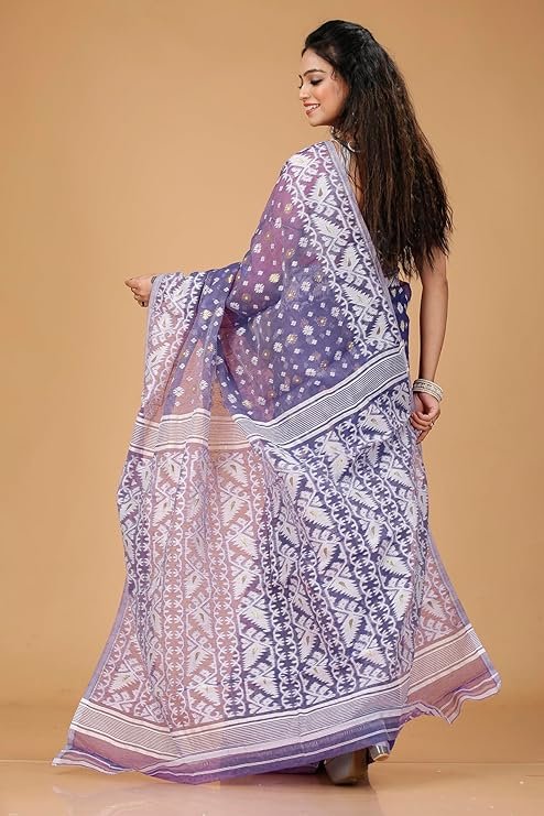 - About Jamdani Saree: Jamdani sarees are made of high quality cotton muslin, which is very thin and soft, making the saree very light and airy. Jamdani sarees are characterised by eye-catching ornamental motifs woven onto the fabric. These intricate motifs in thicker thread seem to float on the surface of the ultra-fine fabric.